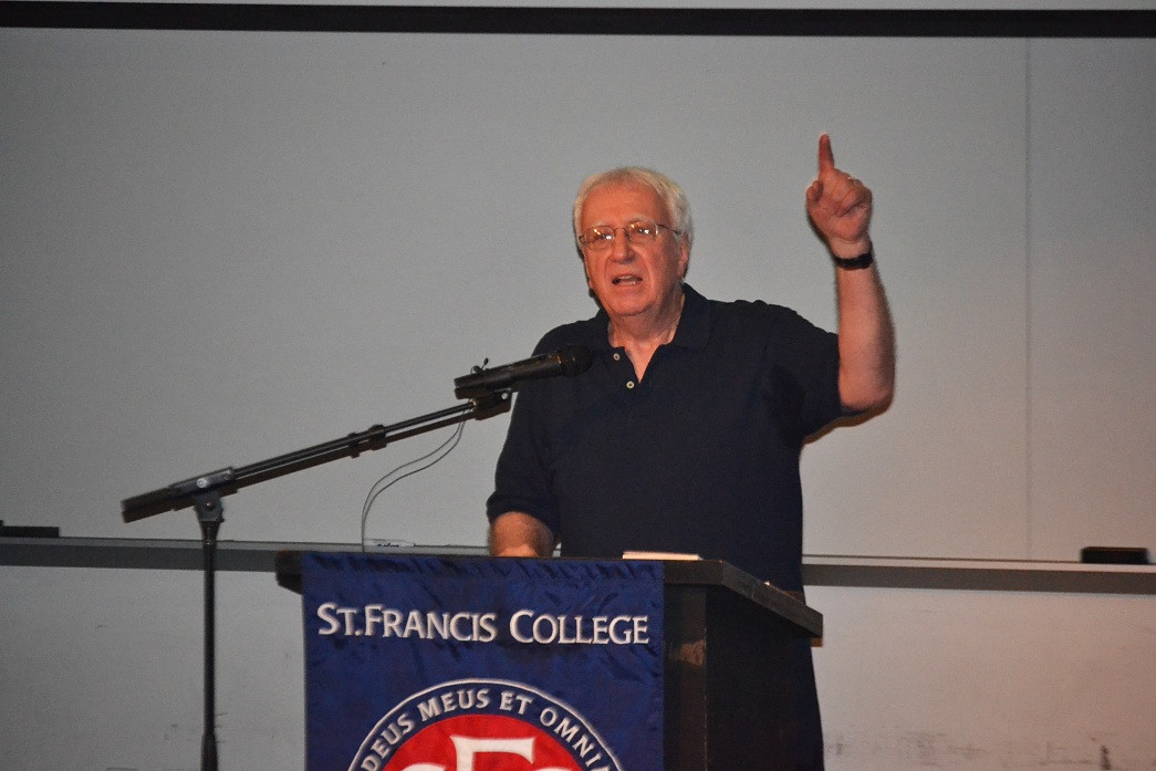 Father André Cirino, OFM, Franciscan author and pilgrimage guide, spoke about the seldom discussed heroics of three men from the city of Assisi – one who helped save the city from destruction and the other two saving the lives of between 250 and 300 Jews from the Holocaust - for the 15th Annual Yom Hashoah Holocaust Remembrance Day event on April 28 at St. Francis College.