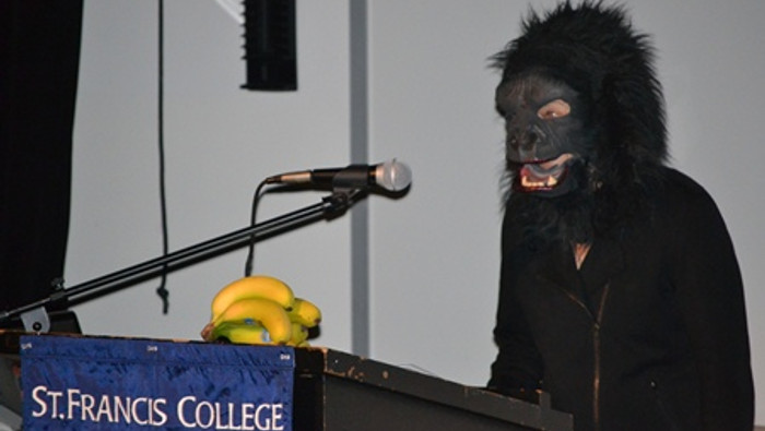 Wearing a gorilla head mask and entering from the back door of the Maroney Forum for Arts, Culture & Education, Guerrilla Girl, "Frida Kahlo" (a pseudonym borrowed from the celebrated female artist), offered the audience bananas as she made her way down to the stage.