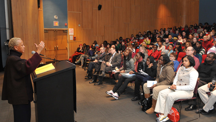 St. Francis College's Founder Hall was not big enough to hold everyone who wanted to see Poet Nikki Giovanni deliver a rapid fire lecture of cultural quips, stories and, of course, the poems she is so well known for as part of the College's Black History Month celebrations, Monday, February 9. Several dozen people watched Giovanni on a simulcast in the adjacent Callahan Center.