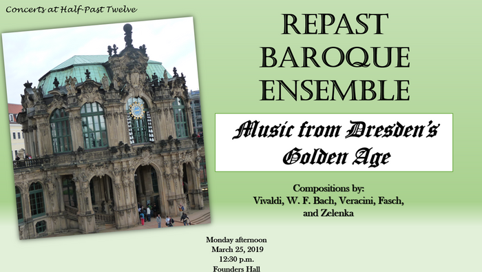 Concerts at Half Past Twelve returns for the second performance of the spring series, with members of the acclaimed Repast Baroque Ensemble performing music from the Golden Age of Dresden, a period in the early and mid-eighteenth century during which composers in the German city created some of the most timeless Baroque music.