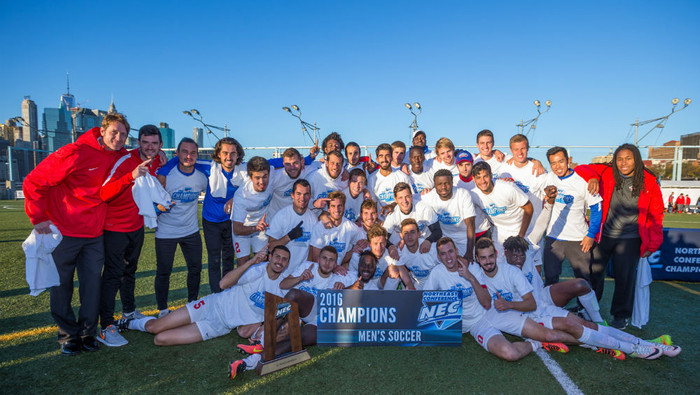 Junior Lukas Hauer buried a penalty kick in the back of the net during the second overtime period against the St. Francis University Red Flash to give the St. Francis College Terriers the victory in the Northeast Conference Championship Game Sunday, November 13 on their home field at Brooklyn Bridge Park.