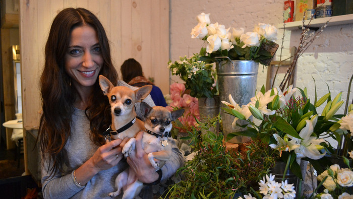 With her pet Chihuahuas, Piper and Penelope on her lap, Denise Porcaro '00 pieced together the elements of her life that brought her to the Lower East Side and the new home of Flower Girl NYC, her floral design shop.