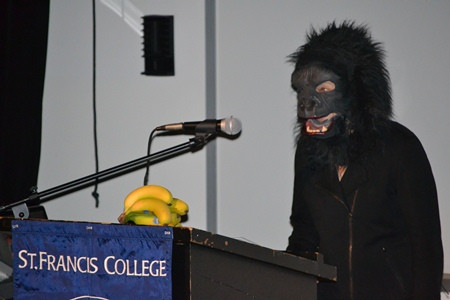 Wearing a gorilla head mask and entering from the back door of the Maroney Forum for Arts, Culture & Education, Guerrilla Girl, "Frida Kahlo" (a pseudonym borrowed from the celebrated female artist), offered the audience bananas as she made her way down to the stage.